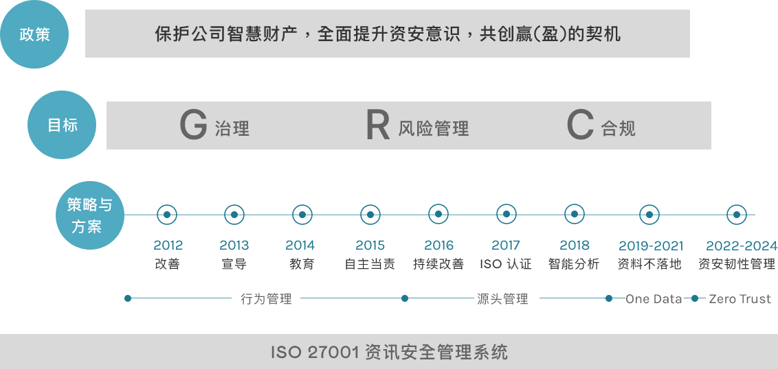 大发平台每年订定执行资安策略及行动方案,透过延续性的方案及考量内外部关注议题,于全公司范围展开实施全新行动以符合资讯安全管理系统 ISO27001,并制定关键指标监督,透过PDCA循环改善,以期逐年降低资安风险及提高公司资安成熟度。