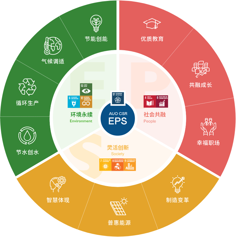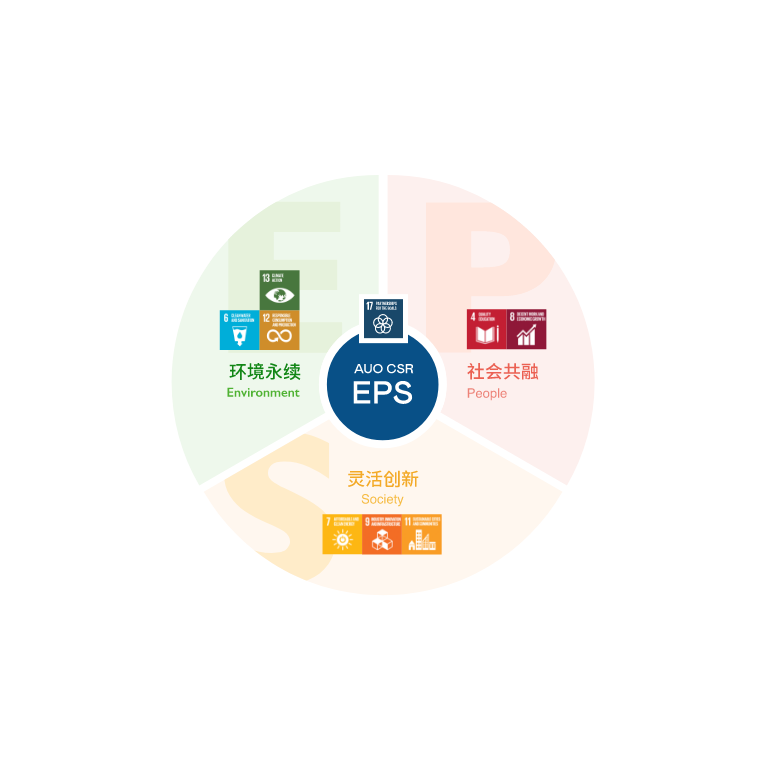 根据联合国所发展的17项永续发展目标,大发平台光电以「超越企业社会责任,创造共享价值」为企业永续愿景发展蓝图,订出环境永续、共融成长与灵活创新的EPS(Environment, People & Society)三大永续发展主轴;以响应日益受关切的环境议题与社会共融趋势。