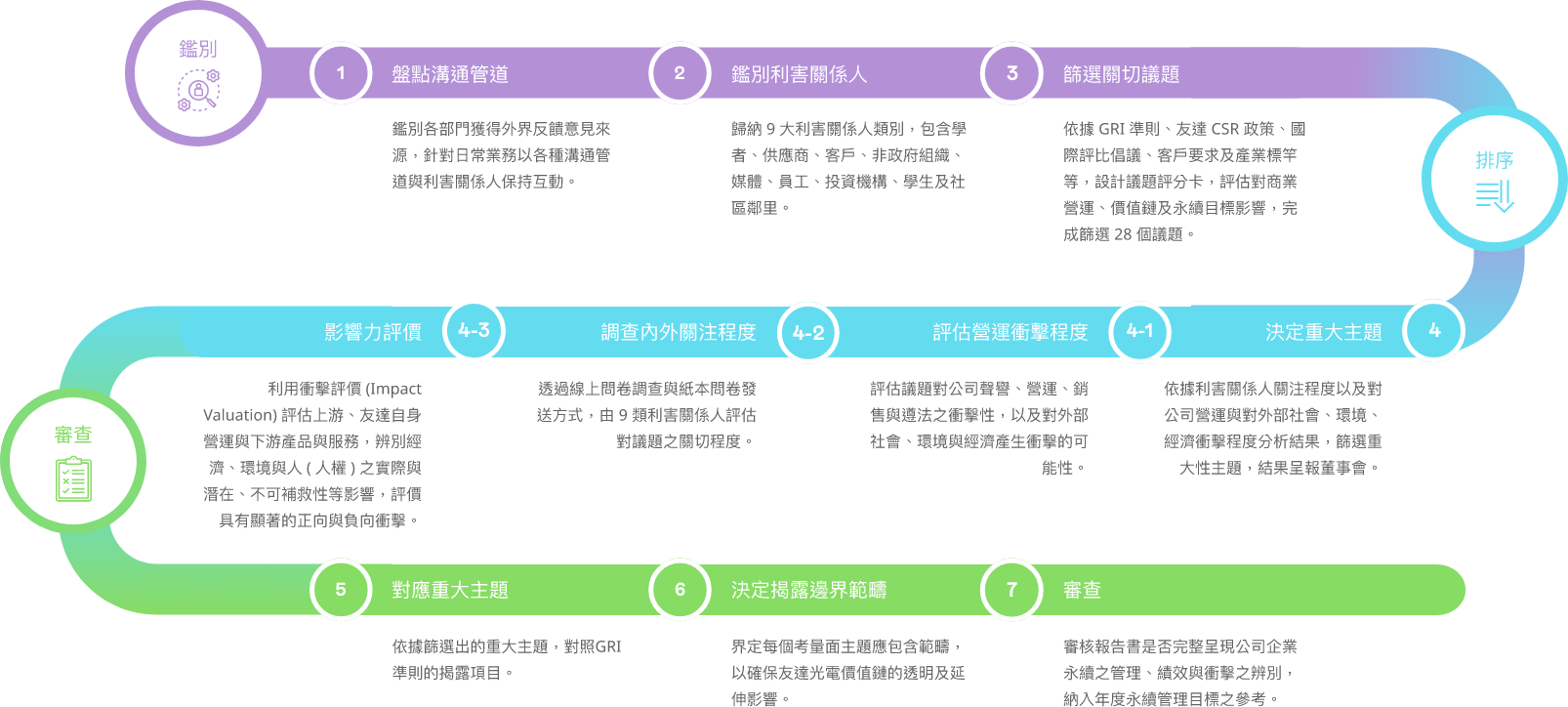 | 技術創新與市場佈局 | 透過客戶經營、產品營運、市場佈局、新事業開發等策略制定,及研發技術導入、創新作法等,是公司競爭力的核心關鍵 | 直接 | GRI 204 GRI 308 GRI 414 |