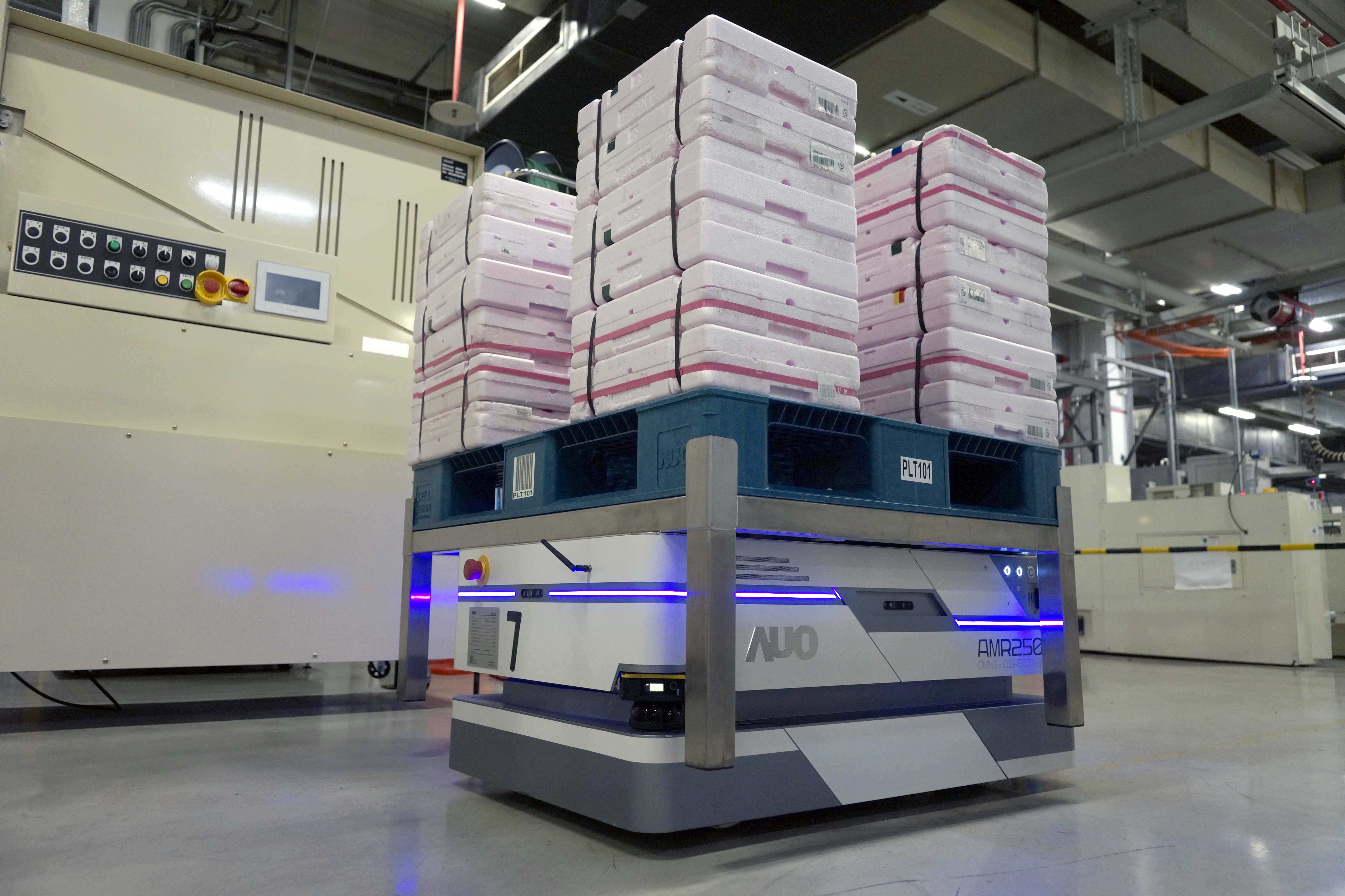大发平台运用数字孪生系统,结合AMR无人搬运车进行派送,达成低库存高效率的智能化仓储物流管理。
