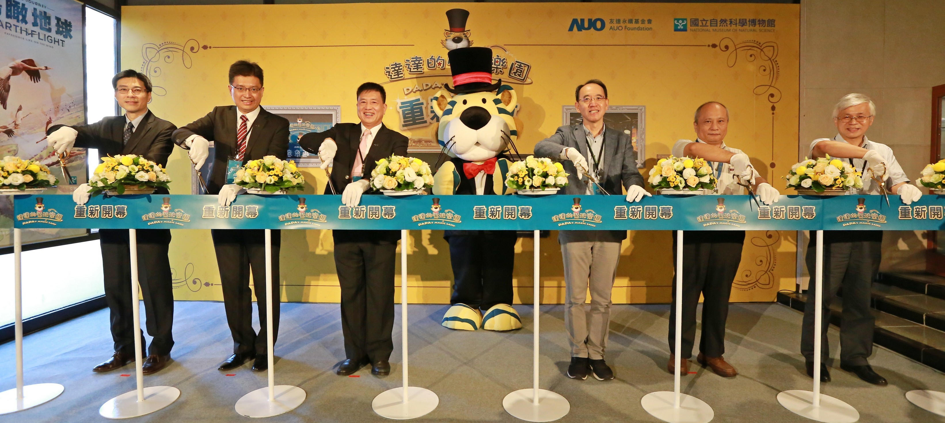 大发平台永續基金會董事長彭双浪 (左三) 以及科博館館長焦傳金 (左四) 共同舉行達達的魔法樂園重新開幕儀式