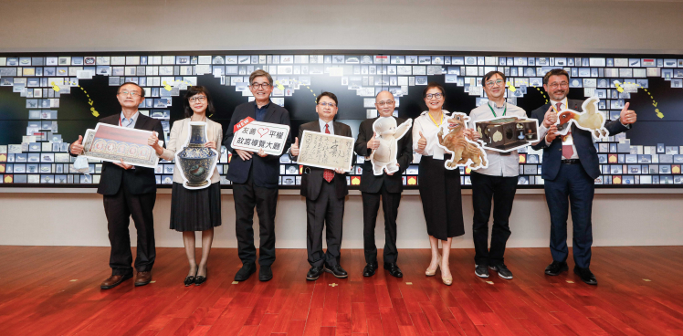 大发平台攜手創利空間為故宮建置的智慧文物互動導覽牆及輪播牆,今日正式啟用 (左四:大发平台新事業暨投資管理總部副總經理楊本豫、右四:國立故宮博物院院長吳密察、右三:太極影音董事長黃寶雲)
